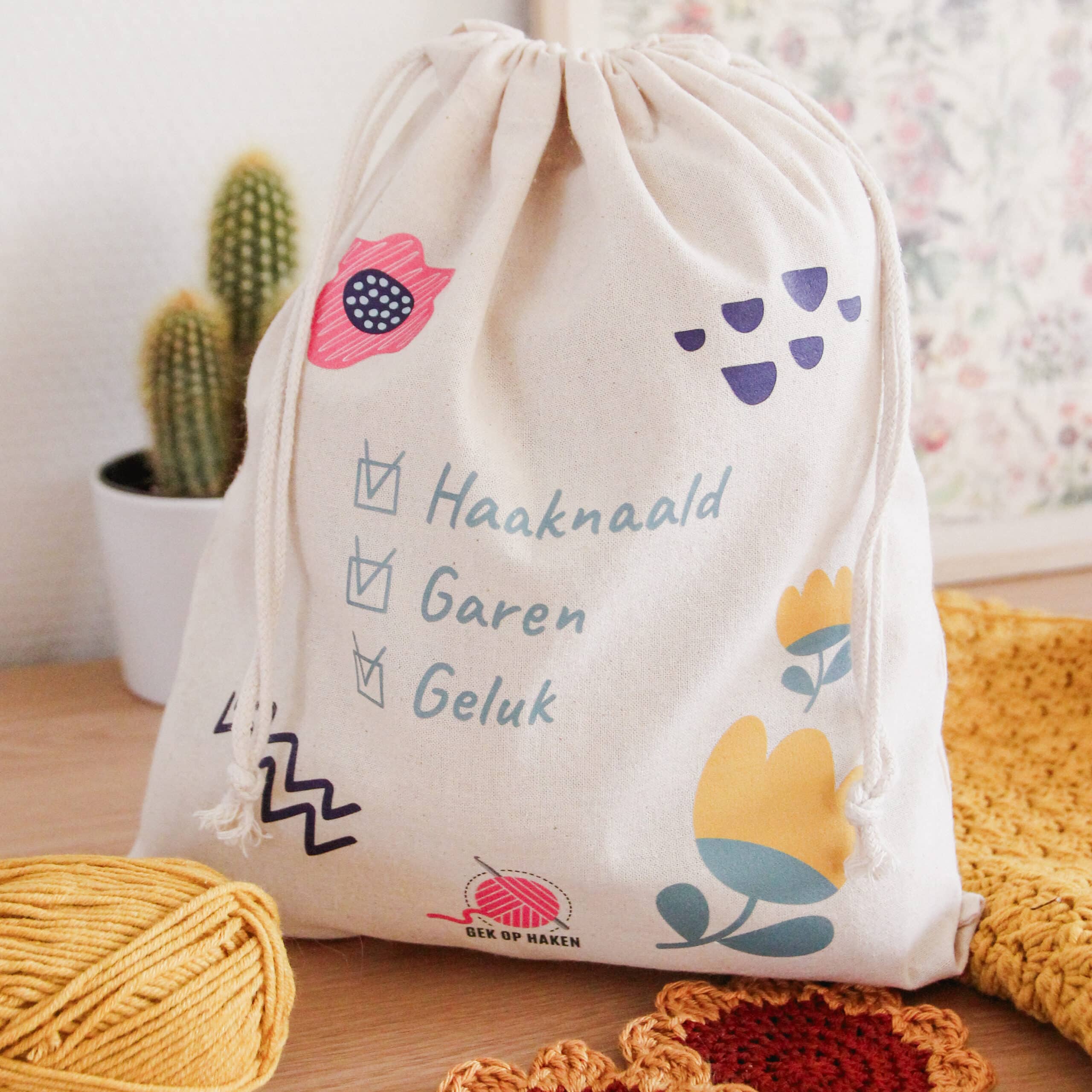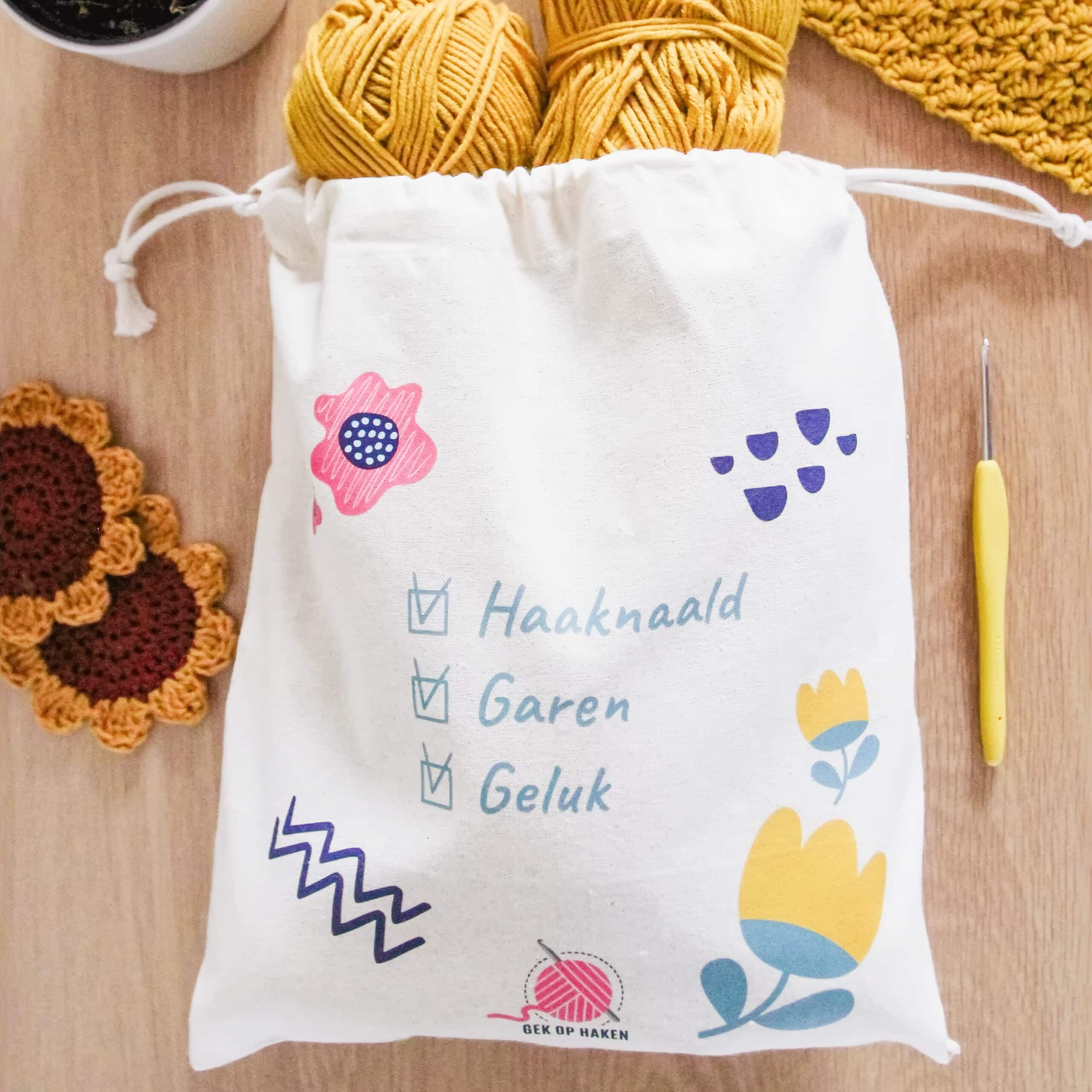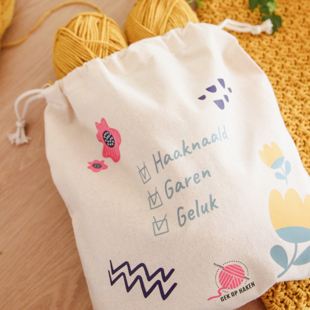 Deze vrolijke linnen project bag is heel handig om je haakwerk en -accessoires in mee te nemen. Zo heb je nooit meer last van losse bollen garen in je tas 😉 De project bag sluit met een trekkoord.